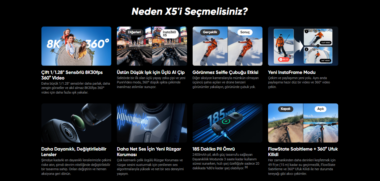 Temel özelliklerin yanı sıra ınsta360 x5 modeline kazandırılan diğer donanımlar da kullanıcıların beğenisini toplamayı başardı. İşte mükemmel çekimler yapmanızı sağlayacak olan o özellikler...